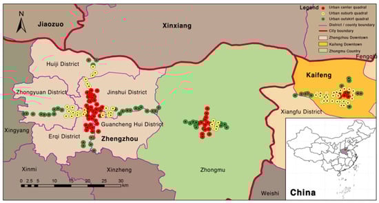 The study is focused on Henan Province’s urban agglomeration, which has grown quickly in recent years in China’s central area. Henan is the province with the greatest population in China and is guided by multiple national policies. The urban agglomerations in Henan are excellent locations to undertake research on whether the impacts of urbanization on plant variety are constant for cities of various sizes in the same region. This work was conducted in Zhengzhou, Kaifeng, and Zhongmu County, the central urban agglomeration of Henan Province. The economy of the urban agglomerations with Zhengzhou as the center has grown quickly, and urbanization is happening more rapidly due to the policy of collaborative development of regional urban agglomerations. Zhengzhou, Kaifeng, and Zhongmu County are geographically close and have similar climates; they belong to the warm temperate continental monsoon climate. The largest difference among the three cities is size. Zhengzhou is the capital of Henan Province, has a resident population of 12.74 million, and is the only megacity with an area of 7567 km2 and an urban area of 744.15 km2. Kaifeng is a prefecture-level city in Henan Province, and it has a resident population of 4.82 million, an area of 6239 km2, and an urban area of 151 km2. Zhongmu County is a county-level city in Henan Province, under the jurisdiction of Zhengzhou, located between Zhengzhou and Kaifeng, and it has a 708 thousand resident population, a 917 km2 land area, and a 75.7 km2 urban area. Our study was focused in and around the three cities’ urban centers, which has been the area most considerably impacted by urbanization in recent years.