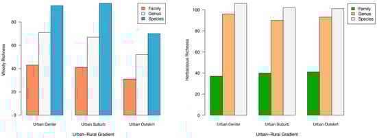 Richness of plant family, genus, and species in different urbanization gradients.