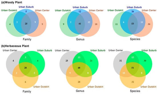 Except for those common to the three urbanization gradients, no species of woody plants were discovered to be shared by urban centers and urban suburbs, according to a Venn diagram (Figure 4). In urban suburbs, the distribution of woody plant species was more similar to that in urban centers (Figure 4a). Although the common species of herbaceous plants in the three gradients were less than those of woody plants, many species were common between the two gradients (Figure 4b). For the common taxon on the different gradients, woody plants had a smaller proportion than herbaceous plants at the family level but a larger proportion at the genus and species levels. Notably, in the three gradients, herbaceous plants exhibited a high percentage of unique species.