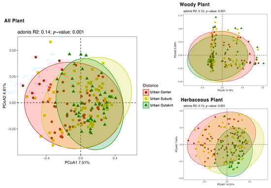 The three urbanization gradients’ plant species were subjected to PCoA analysis (Figure 5). Further PCoA analysis of various plant life forms revealed that in the three urbanization gradients the species difference of herbaceous plants was larger than that of woody plants.