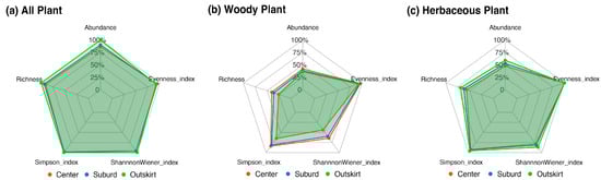 Five distinct plant diversity indices were examined using radar charts, and results showed that at the all-plant level (Figure 6a), the diversity indices of the urban outskirt were superior to those of the urban center and urban suburb. Herbaceous plant diversity indices exhibited the same regularity as those of the all-plant level (Figure 6c). However, in terms of woody plants (Figure 6b), the urban center had the highest diversity of trees, followed by the urban suburbs, and the lowest index was found in the urban outskirts. Data on plant diversity for each quadrat in this study are shown in Table S1.
