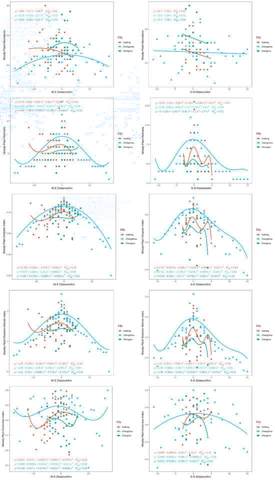 The woody plant diversity of the three cities quadrats revealed various distribution patterns in the west-east (W-E) and south-north (S-N) axes (Figure 7). The linear-regression model demonstrated that the indices of the three cities were higher in the urban center than in the surrounding regions, and each index had a unique regularity. Richness, the Simpson index, and the Shannon–Wiener index of woody plant diversity all had high degrees of gradient fitting, whereas other indices did not alter appreciably. The polynomial fit of the woody plant diversity indices in the three cities’ quadrats was best in Zhengzhou, followed by Kaifeng and Zhongmu County. The single peak and inflection point of the polynomial in Zhengzhou also showed the largest gradient span.