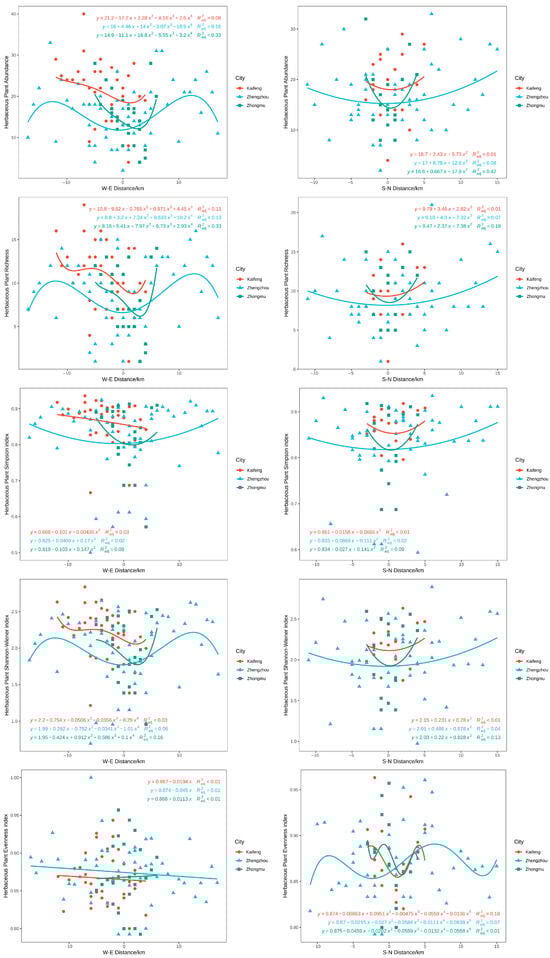 In contrast to woody plants, the distribution patterns of the herbaceous plant diversity varied in the west-east (W-E) and south-north (S-N) axes, and the linear-regression model for the indices showed lower values in the urban center than in the surrounding areas (Figure 8). Although the W-E and S-N diversity of herbaceous plants differed from those of woody plants along the gradient, their polynomial fit was less satisfactory. The Shannon–Wiener index, diversity, abundance, and richness of herbaceous plants, as well as other indices, were relatively well fitted with the gradient; however, other indices did not vary considerably with the gradient. Compared with Zhengzhou and Kaifeng, Zhongmu County had a higher polynomial fitting degree for the diversity indices of herbaceous plants. The single peak and inflection point of the herbaceous polynomial in Zhengzhou showed the largest gradient span, which was the same as the woody plant polynomial.