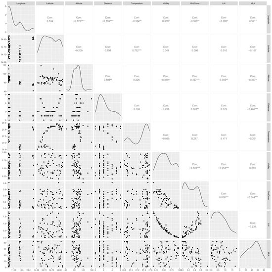 Correlation analysis of different environmental factors. (Note: − means negative correlation; *, **, and *** indicate the significance at p = 0.05, p = 0.01, and p = 0.001).