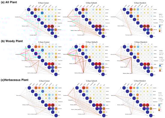 Correlations between all plants, woody plants, and herbaceous plants and environmental factors in different urbanization gradients. The pairwise correlation of environmental factors is shown in the upper right corner. Pearson’s correlation coefficient is represented by a color gradient. The line width represents the relevant Mantel r statistic, and the color represents the correlation coefficient of Mantel p. Distance: the distance from the urban center VisSky, total transmittance ratio GndCover, tree-crown projected area. LAI, leaf area index. MLA, mean leaf angle.