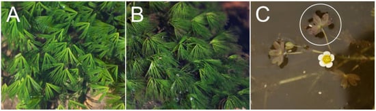 Aquatic plants often exhibit a high degree of phenotypic plasticity [9], which may be induced by environmental characteristics (e.g., nutrient, light, and water) and reproductive strategies (e.g., vegetative reproduction, hybridization, and polyploidy) [10,11], and consequently, leading to controversy in species classification and endemic species’ conservation. Among them, the monophyletic group Batrachium (DC.) Gray (Ranunculaceae) is a representative example, the taxonomy of which is obscure and is considered a taxonomist’s nightmare [11,12,13]. Based on results from molecular phylogeny, it has recently been classified as a section within the genus Ranunculus L. [14]. Several species in Batrachium are well known for the simultaneous occurrence of both capillary submerged leaves and laminar floating leaves, especially those distributed in Europe [11]. Because of frequent hybridization and polyploidy, species delimitation in Batrachium is challenging. The plastid psbA-trnH and the nuclear ribosomal ITS regions (nrITS) are suggested as informative in the identification of Batrachium [12,15].
