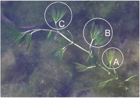 Leave lobes of Batrachium pekinense vary from the relatively broad capillary type (A) at the basal stem to semi-capillary type (B) at the middle and turn to capillary at the top (C) on the same individual. Photographed by Xian-Yun Mu.