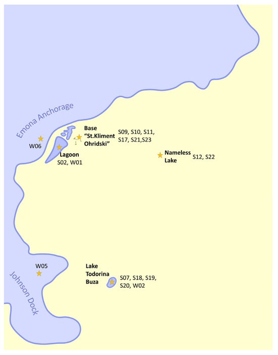 Map of the sampling sites around the Bulgarian Antarctic base “St. Kliment Ohridski”. Hannah Point is not shown, being on the other side of the South Bay.