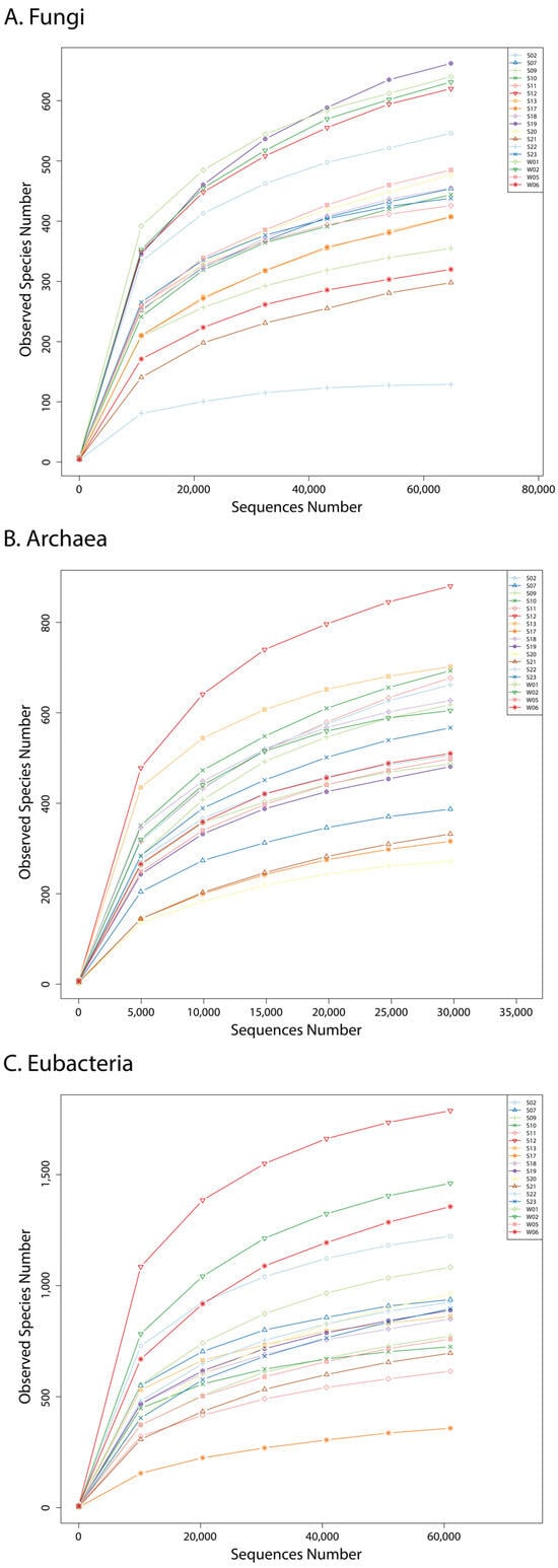 Rarefaction curves of fungi (A), archaea (B), and bacteria (C) in the samples.