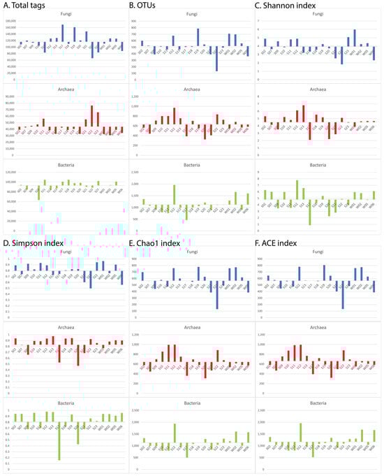 Discrepancies between the three domains in the observed numbers of the total tags (A), and OTUs (B), as well as in the calculated Shannon (C), Simpson (D), Chao1 (E), and ACE (F) alpha diversity community richness estimators.