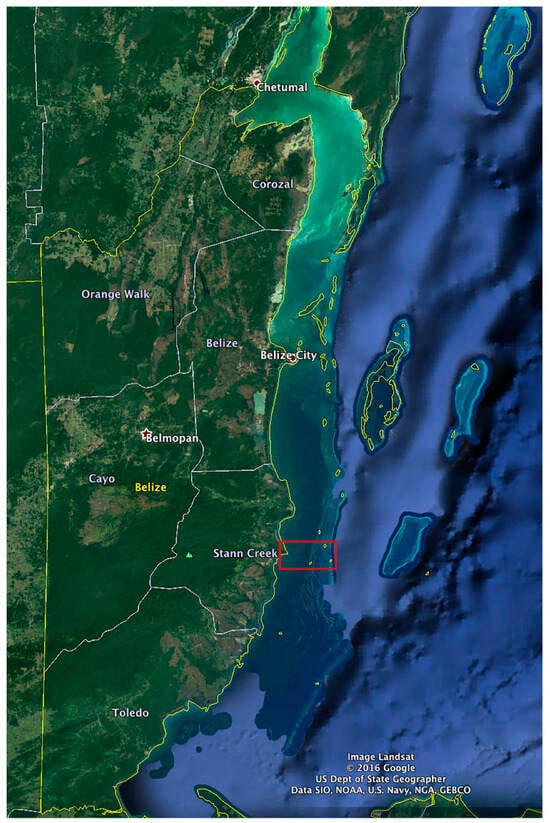 The Barrier Reef region offshore of Belize, Central America. The red box shows the general study site area, shown in detail in Figure 2. (Google Earth map).
