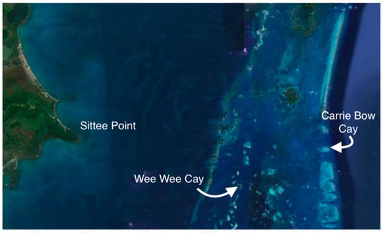 The study location was at Wee Wee Cay, Belize, inside the Belize barrier reef. Onset Corporation’s model HOBO Tidbit temperature loggers (±0.2 °C accuracy with resolution: 0.02 °C at 25 °C) were deployed at an approximate depth of 1.2 to about 2 m during typical tidal variation at Wee Wee Cay (Figure 1) located at 16°45.39 N, 88°8.03 W. Wee Wee Cay is approximately 12.4 km from the Belizean mainland and approximately 7 km from the reef crest (Figure 2). The shallow underwater habitat at Wee Wee Cay contains extensive seagrass beds and numerous patch reefs (Figure 3).