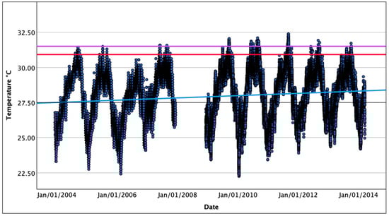 In the years when the temperature measurements spanned the summer months, in the years between 2007 and 2013, the bleaching threshold of 31.5 °C [10] was exceeded (Table 1). The number of days with temperatures exceeding the threshold ranged from 0 to 14 in 2010. September had the highest consecutive number of days exceeding the bleaching threshold. The bleaching thresholds were exceeded on over 10 days in 2010 and 9 days sequentially in 2011 (see Section 3.6).