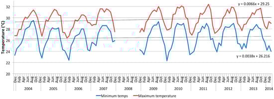 While both the maximum and minimum temperatures exhibited increasing trends during the sampled period, maximum temperatures increased at a rate of 0.0066 °C month−1 compared to 0.0038 °C month−1 for minimum temperatures (Figure 5).