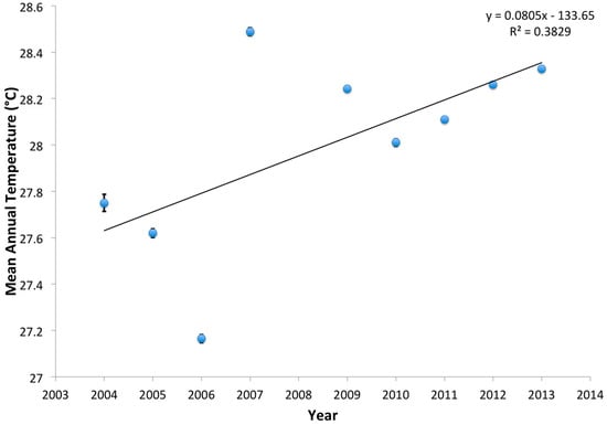 Mean annual temperatures at Wee Wee Cay ranged from a low of 27.2 °C in 2006 to 28.5 °C in 2007, with mean annual temperature increasing at a rate of 0.0805 °C year−1 within the sampled period (Figure 6).