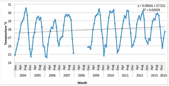 The trend in mean monthly temperatures during the sampled period reflected a rate of increase of 0.0063 °C month−1 (Figure 7). This result can be compared to other studies in Belize during 1984–2003 which showed rates of increase from 0.0024–0.0028 °C month−1 (Table 3).