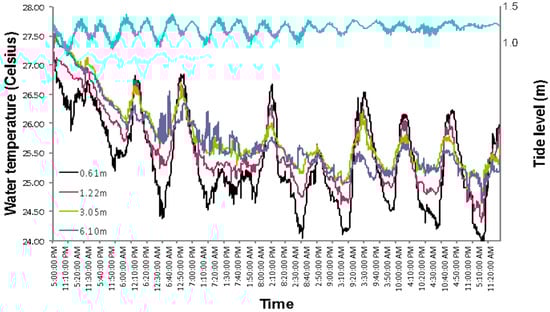 The temperature data reported in this study are from an average depth of 1.2 m. An example of how this station compares to the tide (in blue at top) and to temperatures at different depths from close adjacent sites over a 10-day period is shown in Figure 8. The hourly temperature variation was consistent at all sites and corresponded to the tide.