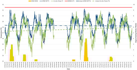 The 10-year record at 0600 Hrs daily. The red line is the calculated MMM + 1 °C for WWC using the in situ data for December 2003 to March 2014, which yielded a MMM temperature of 30.5 °C and a MMM + 1 °C of 31.5 °C. The blue dashed line is linear relationship for CRW SST measurements (r2 = 0.001; p = 0.124) during our time period and the green dashed line is linear relationship for our in situ temp measurements (r2 = 0.016; p < 0.001). The degree heating weeks (DHW) are shown as yellow bar graphs along the x-axis.