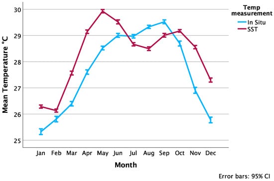The 10-year in situ record compared to SST showing the monthly means. Each point is 9 years of data for each month with 95% CI. The mean difference between the measurements was 0.667 (p < 0.001).
