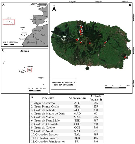 Location of Azores archipelago (A), Terceira Island (B), sampling sites (C), and description of each cave (D).