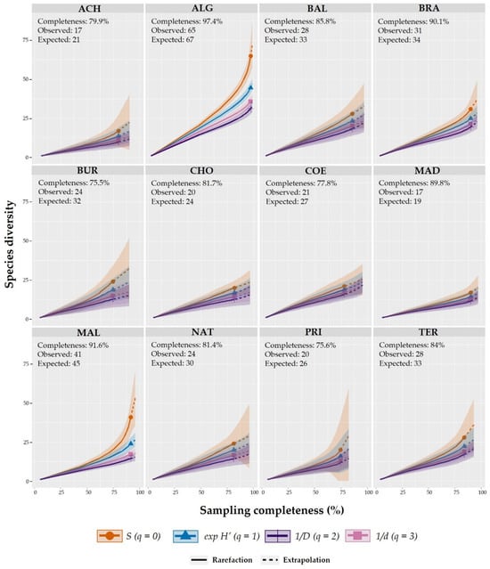 Before comparing diversity across assemblages, the sample completeness of a biological survey and the extent of undetected diversity should first be quantified [68]. Sampling completeness was assessed using a non-asymptotic standardisation approach via coverage-based rarefaction and extrapolation. This approach aims to compare diversity estimates for equally complete samples, where sample completeness is measured by sample coverage [68], determining the percentage of observed richness in comparison to the estimated non-asymptotic richness following Chao et al. [69] and Hsieh et al. [70]. This concept has been used to objectively quantify sample completeness in many biodiversity studies and has been standardised to compare diversity among assemblages [71,72].