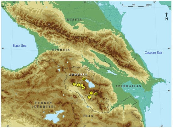 Map of the region with the chosen locations for our fieldwork in Armenia: (a) Sevan, Tsovagyugh, 2000 m, 40°36′08″ N, 44°57′45″ E; (b) Antarut, 1780–1985 m, 40°22′36″ N, 44°16′03″ E; (c) Victory Park, Yerevan, 1142 m, 40°11′47″ N, 44°31′17″ E; (d) Jrvezh Forest Park, 1515 m, 40°11′07″ N, 44°37′11″ E; (e) Garni, 1312–1355 m, 40°07′18″ N, 44°45′17″ E; (f) Yeghegis, 1574 m, 39°52′10″ N, 45°22′12″ E; (g) Jermuk, 2000 m, 39°50′25″ N, 45°40′07″ E; (h) Noravank, 1468 m, 39°40′57″ N, 45°14′10″ E (Base map courtesy of Dr. Virginijus Gerulaitis, Vytautas Magnus University, Lithuania).
