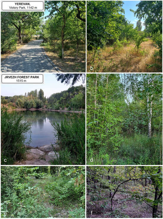 Collection sites in Armenia: (a,b) Victory Park (or “Park Pobedy”), situated somewhat north of Yerevan city center, created in the 1930s by planting various mainly decorative trees and shrubs, including maples, poplars, plane trees, elms, ash trees and other trees; (c–f) Jrvezh Forest Park, in the western area of Yerevan city (belongs to Kotayk Province), created in the mid-1900s by the systematic planting of tree and shrub vegetation, both deciduous and coniferous; the park includes an old artificial pond.