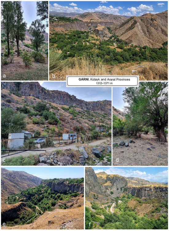 Garni, Kotayk Province (1312–1355 m, 40°07′18″ N, 44°45′17″ E–40°06′41″ N, 44°43′55″ E) and Garni, Ararat Province (1371 m, 40°07′27″ N, 44°45′40″ E) (Figure 4a–f). Both habitats are located in central Armenia, on the sides of a gorge at the confluence of the Rivers Goght and Azat. Along the riversides, mixed riparian floodplain and gallery woodlands (G1.2) occur along old-growth willows (Salix spp.) and poplars (Populus nigra). On the slopes, almond open arid forests (F5.342) are common alongside steppe-like communities in some areas on sand substrates (E1.2H1), as well as bare inland basaltic and ultra-basic cliffs (H3.2H).