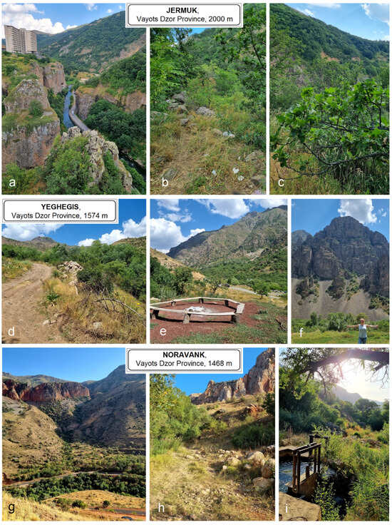 Collection sites in Armenia: (a–c) Jermuk, Vayots Dzor Province, on the southern slopes of the Vardenis Range, with remnants of oak forests comprising Quercus macranthera along with other artificially planted trees; (d–f) Yeghegis, Vayots Dzor Province, on the southern slopes of the Vardenis Range, with a predominance of hawthorns, plums, nettle trees (Celtis caucasica) and wild roses; (g–i) Noravank, Vayots Dzor Province, on the northern slopes of the Vayots Dzor Range, with thickets of Salix and Tamarix and a predominance of Celtis, Rhamnus cathartica and Rh. pallasii.