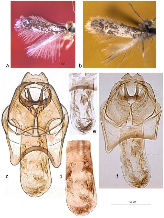 The first photographic documentation of Stigmella armeniana Puplesis, a previously little-known species named after Armenia []: (a) adult, holotype; (b) same, paratype; (c,d) male genitalia, holotype, slide no. AN375; (e,f) the same paratype, slide no. AN376 (MfN) (the arrow points to the most important character).