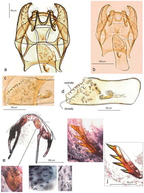 Figure 11. Genitalia of Stigmella armi Stonis, Dobrynina & Remeikis, sp. Nov.: (a–d) holotype, details of male genitalia, slide no. DV122 (MfN); (e–j) paratype, details of female genitalia slide no. DV041 (MfN): I apophyses; (f) ovipositor pad; (g,h) pectinations; and (i,j) vaginal sclerite (the arrow points to the diagnostic character).