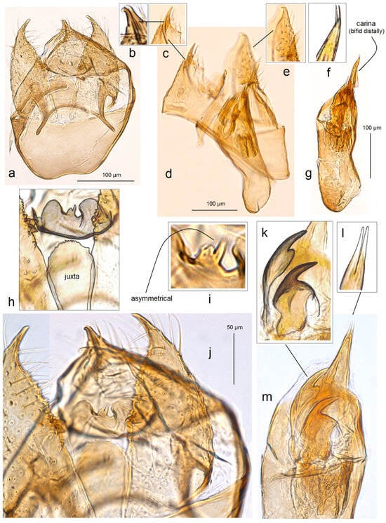 Dissected sclerites of the male genitalia of Ectoedemia (Zimmermannia) longicaudella Klimesch: (a–c) gnathos; (d–h) valva; (i–k) vinculum; and (l,m) phallus.