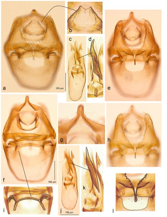 The first photographic documentation of Stigmella muricatella (Klimesch), previously a little-known Nepticulidae species found to be abundant among the samples of all other hitherto discovered species in Armenia: (a–d) adults; (e,f) male genitalia, slide no. DV060; (g) the same, slide no. DV101 (h,i) female genitalia, slide no. RA1135 (MfN) (the arrows point to the diagnostic characters).