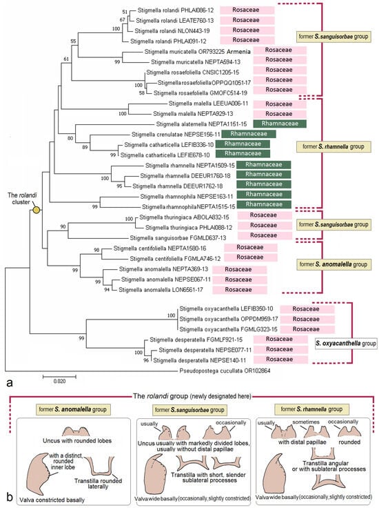 - Doorenweerd, C.; van Nieukerken, E.J.; Hoare, R.J.B. Phylogeny, classification and divergence times of pygmy leaf-mining moths (Lepidoptera: Nepticulidae): The earliest lepidopteran radiation on Angiosperms? Syst. Entomol. 2016, 42, 267–287. [Google Scholar] [CrossRef]