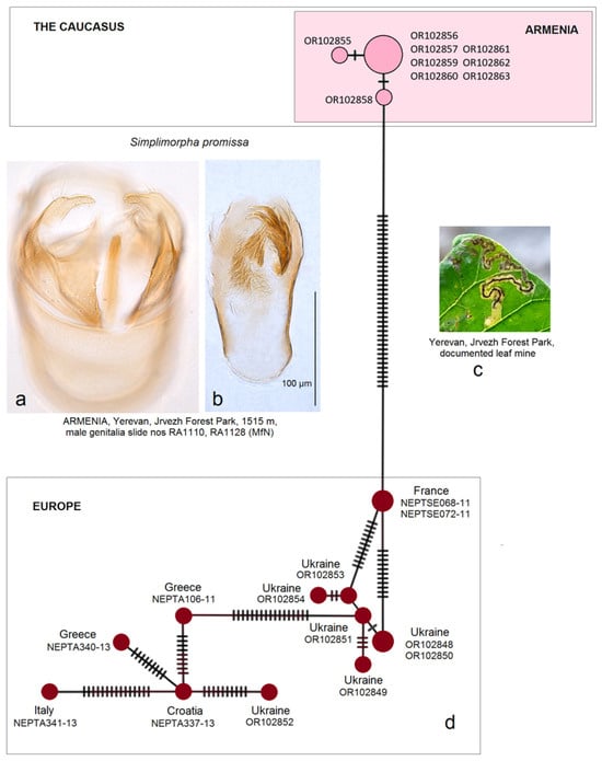 - Orlovskytė, S.; Dobrynina, V.; Stonis, J.R. Unexpected mitotype diversity of Simplimorpha promissa (Lepidoptera: Nepticulidae) in Ukraine and Armenia revealing a possible cryptic taxon. Zootaxa 2023, 5336, 113–124. [Google Scholar] [CrossRef]