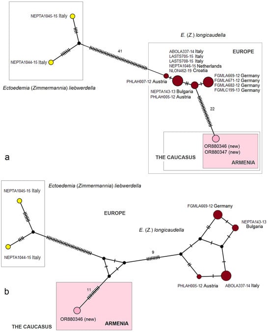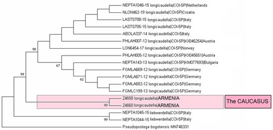 Molecular analysis. Genomic DNA was obtained from the 96% ethanol-preserved larval stages or adults using the GeneJet Genomic DNA Purification Kit (Thermo Fisher Scientific Baltics, Vilnius, Lithuania) protocol. The primers T3Lep-f (5′-attaaccctcactaaagtcwachaatcataaaratattgg-3′; modified Lep-f1 []) and T7Nancy-r (5′-aatacgactcactataggdaraattaraatrtaaacytcwg-3′; modified Nancy []) were used to amplify the partial sequences of the mitochondrial DNA cytochrome c oxidase subunit 1 (mtDNA CO1-5′). All PCR mixtures contained 12.5 µL of a 2× DreamTaq Green PCR Master Mix (Thermo Fisher Scientific Baltics, Vilnius, Lithuania), 2.5 µL of 10 pmol/μL of each primer, 1–2 µL of genomic DNA, and deionized water up to a total volume of 25 μL. The PCR thermal regime was as follows: initial denaturation at 95 °C for 5 min; 45 cycles of denaturation at 94 °C for 40 s, annealing at 45 °C for 40 s, and extension at 72 °C for 1 min; the final extension was at 72 °C for 5 min. Each PCR product was electrophoresed on 1.5% agarose gel (Thermo Fisher Scientific Baltics, Vilnius, Lithuania), stained with 10,000× GelRed (Biotium, Fremont, CA, USA) and visualized under UV light; GeneRuler Express DNA Ladder (Thermo Fisher Scientific Baltics, Vilnius, Lithuania) was used for the size measurement of the amplified DNA sequences. PCR products were subsequently purified using the Exonuclease I and FastAP Thermosensitive Alkaline Phosphatase (Thermo Fisher Scientific Baltics, Vilnius, Lithuania) protocol. Automated sequencing in both directions was performed in BaseClear B.V. (Leiden, The Netherlands) using the ABI 3730xl 96-capillary DNA analyzer (Applied Biosystems, Foster City, CA, USA). The obtained DNA sequences were manually aligned using BioEdit 7.2.5 software []. All data were deposited in the NCBI GenBank database (https://www.ncbi.nlm.nih.gov/genbank/ accessed on 1 January 2024) under the accession numbers OR793219–OR793227, OR880346, and OR880347. Moreover, for further analysis, sequences were downloaded from the GenBank and the Barcode of Life Data System (BOLD) platform [,] (https://www.boldsystems.org accessed on 1 January 2024). The Neighbor-Joining (NJ) trees based on Kimura 2-parameter [] or Tamura 3-parameter [] models with a gamma distribution and 1000 or 10,000 bootstrap replications were constructed using the MEGA 7.0 software []. Mitotype diversity was obtained using the DnaSP 6 program []. ClustalX2 [] was used for the Fasta format conversion to Nexus. The mitotype networks were generated using the Median Joining Network, Minimum Spanning Network [], and the TCS Network [] algorithms, which were implemented in the PopArt 1.7 program (http://popart.otago.ac.nz accessed on 1 January 2024).
