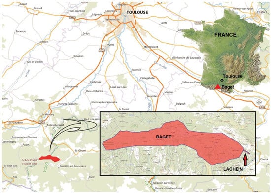The Baget catchment is located in the southern part of the Lestelas-Balaguères massif in Ariège. It adjoins the Arbas massif to the West at the level of the ridges passing through the Pic de Cornudère and the Tuc de Pissarelle. According to the limits proposed by A. Mangin [4,10,11,12], it extends from West to East over ten kilometers long with a fairly irregular width varying from 1 to 2 km. It is drained by the exsurgence of Las Hountas, located at its eastern end. The catchment covers 13.25 km2, of which 4 km2—i.e., around 30%—are of impermeable non-calcareous terrain.