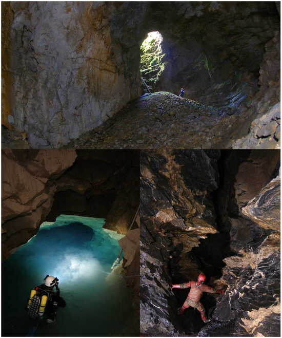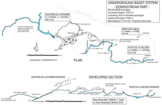 Puits de la Hillère, Perte de la Hille and the gouffre de la Peyrère are located in the downstream part of the system, approximately 1 km from the outlet. Recent explorations by cave diving have allowed connecting these three caves together [6]. They form a network of passages more than 1500 m long, including 800 m of flooded conduits (Figure 2).