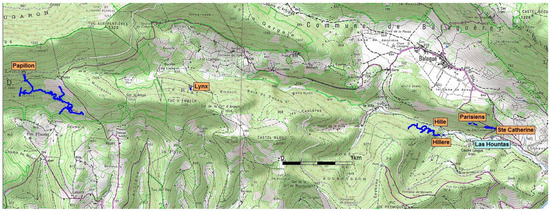 Relative positions of the main caves of the Baget system (see Figure 1 for location), from Gouffre du Papillon, upstream, to the exsurgence de Las Hountas. From CartoExplorer 3.