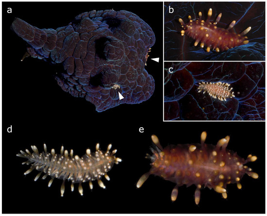 (a) Coriocella cf. tongana MNHN-IM-2019-26118 (50 mm in length) with two Asterophilia cf. culcitae hidden in the mantle (indicated by arrowheads). (b,e) A. cf. culcitae MNHN-IA-2021-676 (10 mm in length, 2 mm maximum width without parapodia, 6 mm with parapodia). (c,d) A. cf. culcitae MNHN-IA-2021-675 (5 mm in length, 1 mm maximum width without parapodia, 3 mm with parapodia). Photo credits: MNHN, G.F.