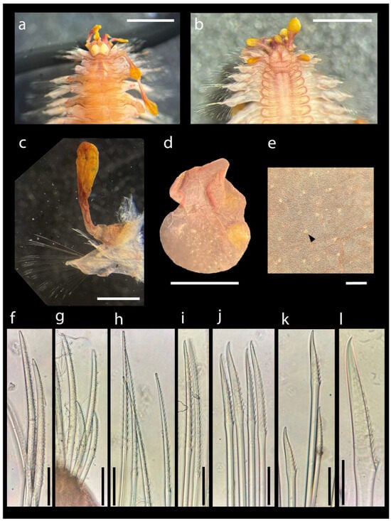 Asterophilia cf. culcitae MNHN-IA-2021-676. (a) Anterior end, dorsal view. (b) Anterior end, ventral view. (c) Parapodium of 8th chaetiger with dorsal cirrus, posterior view. (d) Elytron. (e) Detail of elytron with micropapillae (indicated by arrowhead). (f,g) Notochaetae. (h) Upper neurochaetae. (i,j) Middle neurochaetae. (k,l) Lower neurochaetae. Scale bars: (a–d) 1 mm; (e–k) 100 µm; (l), 25 µm. Photo credits: G.F.