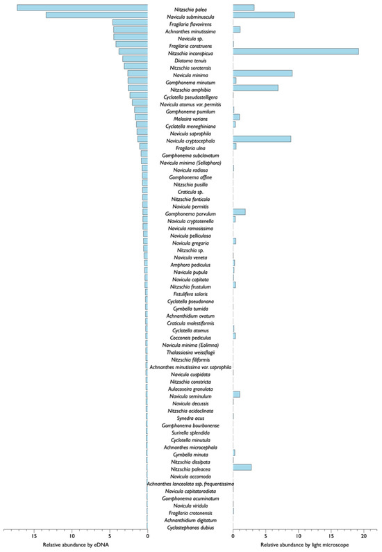 Taxonomic differences in benthic diatom species occurrence based on diatom species identification methods: eDNA metabarcoding (left bar) and light microscope (right bar). Diatom species targeted over 0.1% relative abundance in eDNA metabarcoding.