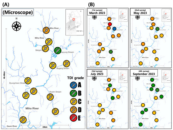 Assessment of ecological health for benthic diatom based on light microscope. (A) Averaged during research period. (B) Assessment on each survey. In the TDI assessment results, the colors inside the circles represent the following: Blue: Very good, Green: Good, Yellow: Moderate, Orange: Poor, Red: Very bad.