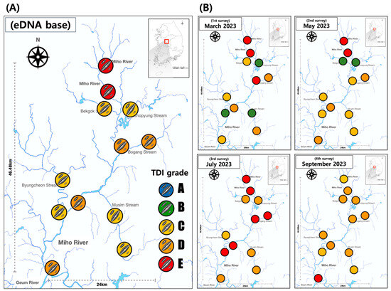 Assessment of ecological health for benthic diatom based on eDNA metabarcoding. (A) Averaged during research period. (B) Assessment on each survey. In the TDI assessment results, the colors inside the circles represent the following: Blue: Very good, Green: Good, Yellow: Moderate, Orange: Poor, Red: Very bad. In the TDI assessment using eDNA, no A-grade was detected.