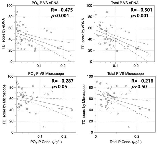 To investigate the correlation between the Trophic Diatom Index (TDI) derived from both microscopy and environmental DNA (eDNA) methods in this study and water quality, bivariate correlations between each index and concentrations of total phosphorus and phosphate were analyzed. The correlation analysis included the presentation of a 95% confidence interval, and Spearman correlation coefficients (r values) were calculated, validating statistical significance at the 0.001 and 0.05 levels. Statistical analyses were conducted using IBM SPSS Statistics (version 29.0.1.0, IBM, Armonk, NY, USA), and Plot graphs with 95% confidence intervals were displayed using DataGraph (version 5.2, Visual Data Tools, Inc., Chapel Hill, NC, USA).