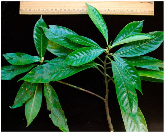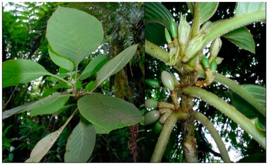 This species was previously undescribed. A small population of five individuals was located in one area below the steep peak of Mt. Mutunte and described by Lorence and Wood [22]. This species differs from other Psychotria spp. by its combination of narrowly elliptic leaves with a long acuminate apex, a peduncle less than 2 mm long, and fruit crowned with long calyx tube with dentate lobes [22] (Figure 7). The rest of the slope was intensively searched for other populations, but none were identified. Based on this population, the EIEIO of this species is 0.067% of the island, and it is considered at risk (Figure 3f).