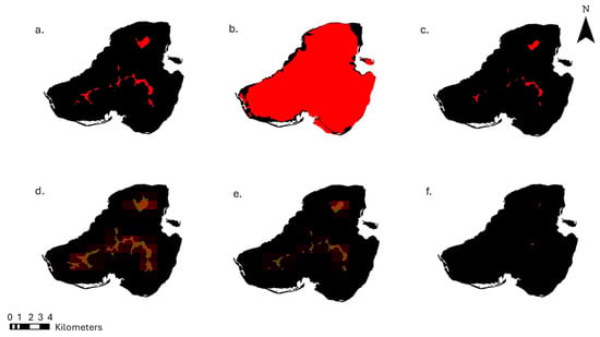 The Extent of Inhabitable Elevation of the Island Occurrence indicated by the red areas (black areas indicate the areas of the island outside of the species range) of (a) Cyrtandra kusaimontana occupies less than 3% of the land area of Kosrae. (b) Elatostema fenkolense corresponds to more than 88% of the land area of Kosrae. (c) Medinilla diversifolia is only found above 460 m, and it only inhabits less than 2% of the land area of Kosrae. (d) Pandanus kusaicolous, a rare species, is found in just above the 5% threshold of the land area of Kosrae. (e) Peperomia kusaiensis occurs on less than 3% of the land area of Kosrae; it is fairly common in these areas, (f) Psychotria kosraensis is a newly discovered species, is extremely rare, and only occurs on less than 1% of the island of Kosrae.