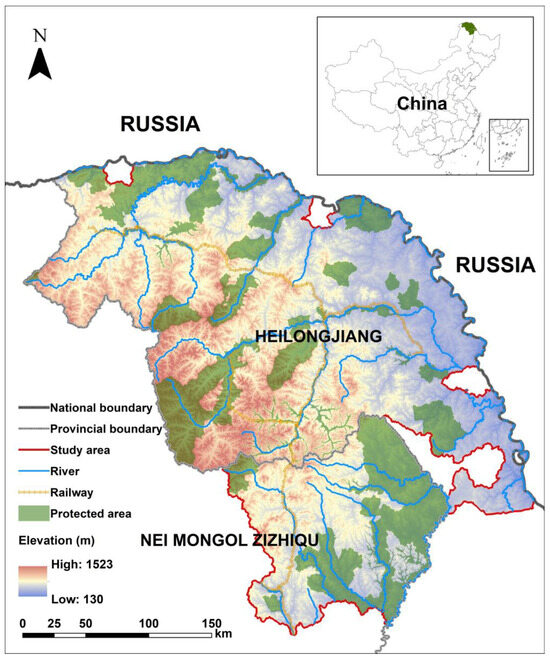 The state-owned forest region of Daxing’anling is located in the north of Heilongjiang Province and Nei Mongol Zizhiqu of China (121°10′–127°01′ E, 50°07′–53°33′ N), connecting with Xiaoxing’anling Mountains in the east and Daxing’anling Mountains in the west, neighboring with Songnen Plain in the south, and arriving at Russia in the north [64] with a total area of 80,301.78 km2 (Figure 1). The region is the main water catchment area for Heilongjiang, Nenjiang River, and the northern water tower at a high latitude, with a significant role in water conservation [65]. Among the six key state-owned forest regions in China, the total value of ecosystem services provided by forests and wetlands in the state-owned forest region of Daxing’anling tops the list [66]. The terrain of the study area is generally high in the west and low in the east, with an elevation of 130–1523 m, which belongs to the typical low mountain and hilly landscape. The vegetation type is dominated by the southern cold-temperate deciduous needle-leaved forest represented by larch, and gradually changes to the temperate mixed-broad leaved forest represented by Mongolian oak in the south. The region is regarded as a natural protection barrier for wildlife in the northeast of China [60] in that the forest coverage rate reaches 86.2% and there are abundant wildlife resources, including 43 species of key protected and rare animals [67]. According to the ecological value and protection intensity, China’s PAs are divided into three kinds: national parks, nature reserves, and nature parks. There are a total of 47 PAs in the study area, including 31 nature reserves (NRs) and 16 nature parks (NPs), with a total area of 23,355.95 km2. At the end of 2022, the Daxing’anling National Park was formally listed as one of the 49 candidate national parks in the Spatial Layout Plan for National Parks. And the creation of this national park is being steadily promoted.