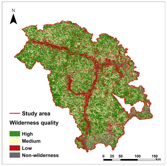 Next, a principal component analysis [48] was performed on the above six indicator layers, resulting in the first four principal components accounting for 99.03% of the total eigenvalues (Appendix A). Then, on the basis of the information of the first four principal components, the ISO clustering unsupervised classification method of spatial analysis in GIS 10.7 [29,71] was used to classify the quality of WAs. And the quality was divided into 10 levels, where 10 indicated the highest quality wilderness [48]. The 10 levels were then classified into three categories: high-quality WAs (levels 8–10), medium-quality WAs (levels 4–7), and low-quality WAs (levels 1–3) [51]. Through the mask tool in GIS 10.7, the wilderness map layer obtained by Boolean was overlaid with the wilderness quality layer to obtain the results of the spatial distribution of wilderness quality of the study area.