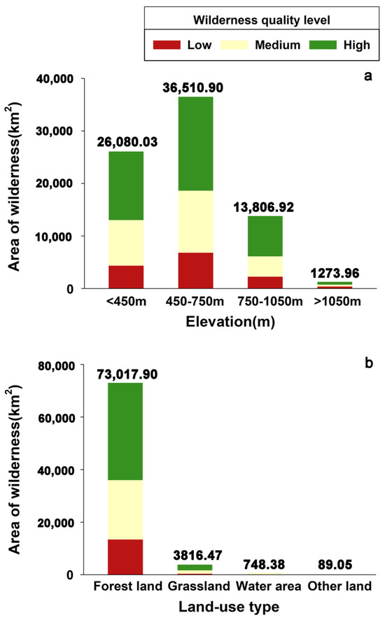 Characteristics of the pattern of WAs. (a) Area of wilderness areas of different quality levels at different elevations. (b) Area of wilderness areas of different quality levels for different land-use types.